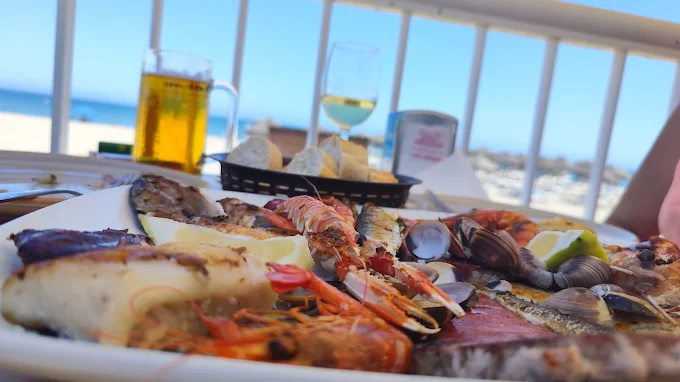 accès roulant & wc 👩🏼‍🦽 , cocktails 🍹 , desserts 🍰 ** , friture de poissons 🐟 , fruits de mer 🪼 , moules , paella fruits de mer 🦐 , paella 🥘 , parking 🅿️ , plage 👙 , poissons frais 🎣🏅 , poulpe 🐙 , riz noir , sardines grillées 🐟 , tapas 🧆 , terrasse (belle)🌹 , transats (location) ⛱ , véritable grill🔥 , vin (belle carte)🍷 , zarzuela 🥣