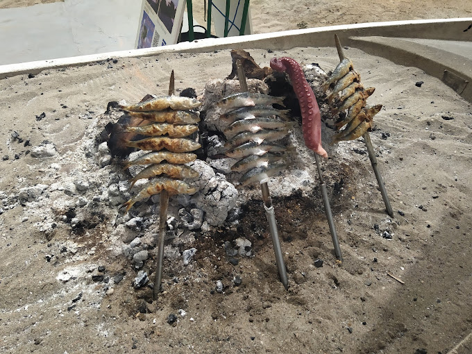 Nous sommes allés manger après la plage, et c’était merveilleux. L’air était frais et agréable. Les serveurs étaient formidables et la nourriture exquise. Nous avons commandé des brochettes de sardines, des petits calamars et du riz mélangé.